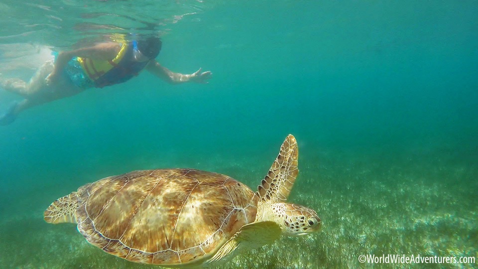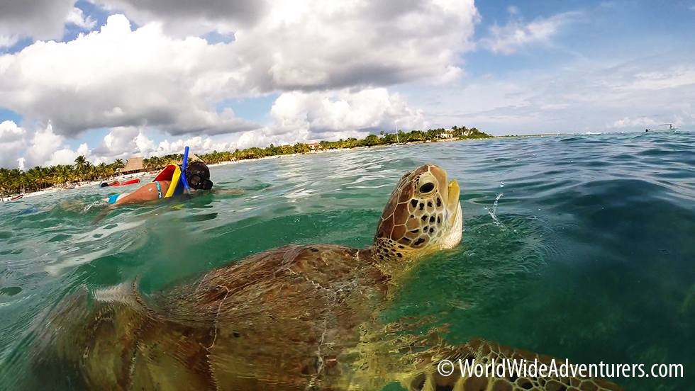 Just rock up to Akumal Beach, jump in, and you’re in Green Sea Turtle Paradise… read more about Swimming with Endangered Green Sea Turtles.