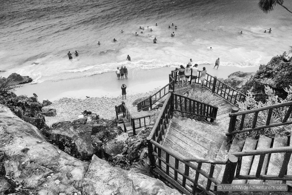 I headed straight to the cliffs for a view of the beach and El Castillo, but it’s just too far away to see much. For a few minutes the beauty of the jade-green, aquamarine, blue water and the white sand beach around us took my mind off the crowd and the rain. I found myself heading down the steps to get closer view of the beautiful beach where people were swimming in the gloriously tepid water in the rain!